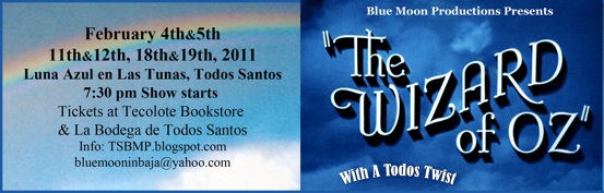 Plan to spend a magical evening under the stars enjoying The Wizard of Oz with a Todos Twist held on February 4,5,11,12 and 18! Tickets can be purchased at Tecolote Bookstore, La Bodega de Todos Santos or Luna Azul. For information, contact bluemooninbaja@yahoo.com.